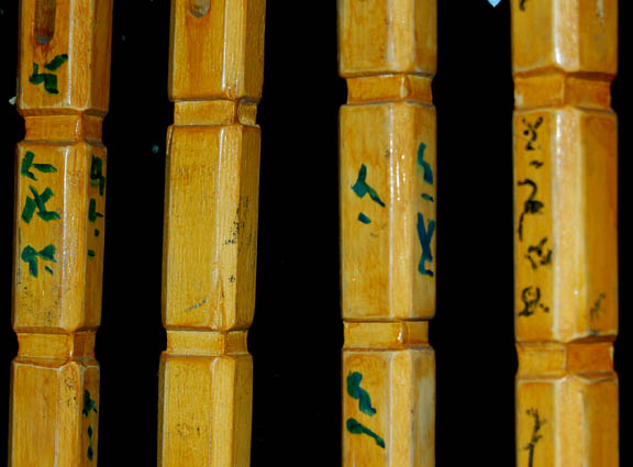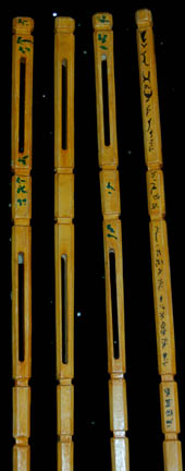 Description: A lot of four shaped wooden staves featured in the Star Trek: Voyager episode “Favorite Son”. The staves feature beveled corners, long openings, painted on alien iconographic lettering, and are varnished lightly. They measure approx. 60 X 2 X 1.5 inches.