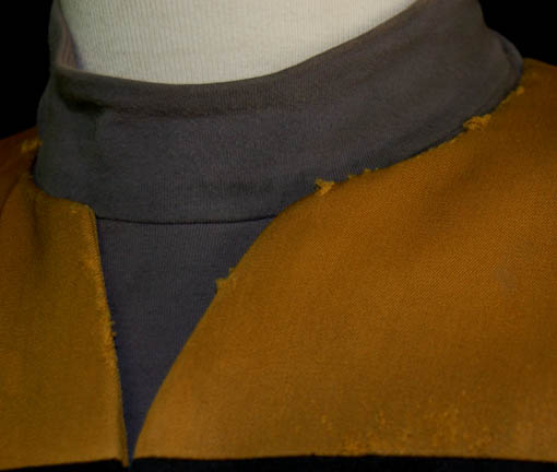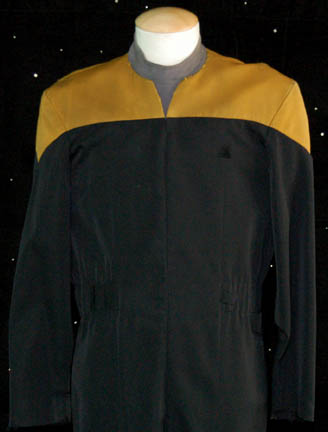 Description: An operations gold Starfleet uniform featured in various episodes of Star Trek: Voyager for wear by Garret Wang in his performance as “Harry Kim”. The costume is a black jumpsuit with yellow shoulders and an elastic form fitting waist, a zip runs up the center. The costume comes with a gray short sleeved undershirt with attached trunks. Distress is evident in that the shoulders feature visible thrashing and the gold fabric is generally darkened to appear worn and ‘dirty'. The jumpsuit features a sewn in voyager tag reading ‘Garret Wang’ and the costumer’s tag reads ‘Harry Kim, Garret Wang, Voyager’ and indicates the components to be distressed and the presence of two costumes, there is only one in this lot.