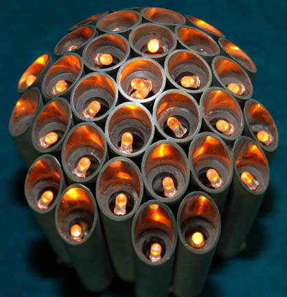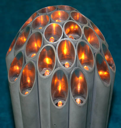 Description: A prop item featured in the season five two part cliff hanger, “Equinox: Part I and II”; wherein “Voyager” comes upon another Federation ship trapped in the Delta Quadrant that has resorted to the murder of another alien species in order to get them home faster. The item is roughly circular in shape, composed of long, hollow, metal cylinders with fluted ends and lights inside. A switch on the bottom activates orange lights with power left from production and four screws hold the cover to a 12 volt lantern/flashlight battery closed. The item measures 5.5 inches in diameter and 9.5 inches in height.