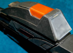 Description: A Starfleet Type III Mark III Phaser rifle the style of which first appeared in Star Trek VIII: First Contact. The prop is molded rubber with all intact accents, a rubber scope with an orange and an opaque and a white acrylic elements, a black nylon shoulder strap statically placed on the side. The item is black with metallic silver paint and measures approx. 33 X 10 X 2 inches.