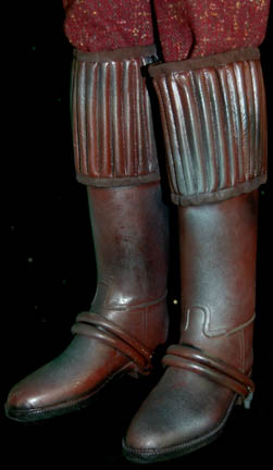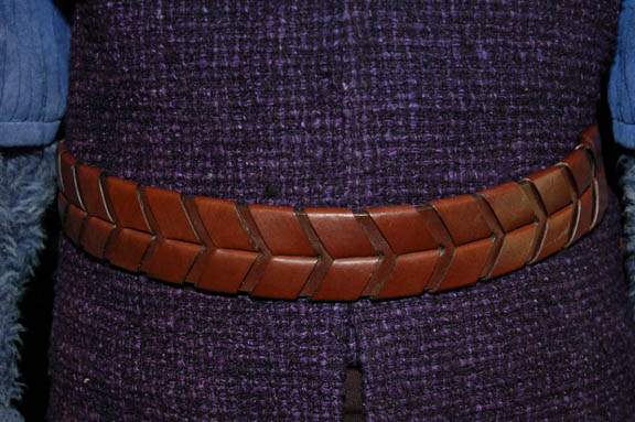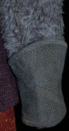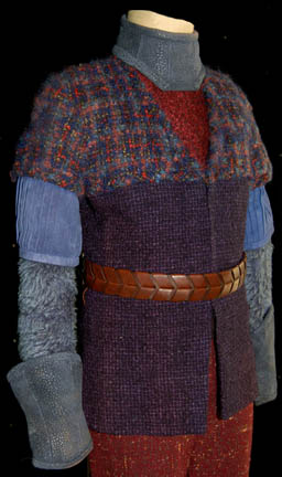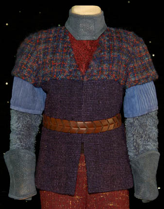 Description: A costume featured in the Star Trek: Deep Space Nine episode “Rules of Engagement”; wherein the Klingon Empire attempts to extradite “Lt. Worf” (Michael Dorn) for supposedly destroying a Klingon transport full of civilians. This costume is one of the Klingon children in “Worf's” dream before he wakes up in the holding cell awaiting trial; it consists of a maroon and black undershirt, a long-sleeved tunic/jacket featuring a multi-colored boucle` along the shoulders, blue pleated accents along the arms, blue faux fur along the rest of the sleeve, and a tight, purple, checkerboard pattern down the front and around the back. Also included are trousers matching the maroon of the undershirt but with random dots of an off-white/yellow shade, a gorget and gauntlets that match the blue of the pleated sleeves, a brown, braided belt, and brownish red, rubber boots that would reach a child’s knee with textured, vertical accents along the top and rubber tubing around the foot. A sewn in tag reads ‘Deep Space Nine, Kent Ostrowski’ and the costumer’s tag reads ‘DS9, 490, Klingon Children’.