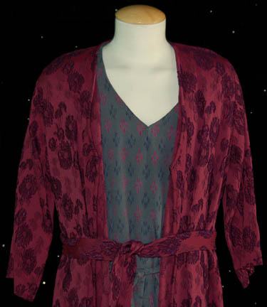 Description: A lot of costumes featured in various episodes of Star Trek: Deep Space Nine. This lot includes two long-sleeved, full-length, matching robes in a burgundy fabric with a slightly wrinkled look, raised, purple brocade in a floral pattern, and matching sashes; two long-sleeved, pewter-colored, pajama shirts featuring roughly diamond shapes in blue and the same burgundy as the robes, with their own sashes, and viridian-colored pajama trousers. Sewn in tags read ‘Deep Space Nine' and either ‘Colm #1’ or ‘Colm #2’ and the costumer’s tag reads ‘DS9, O’Brien, Colm Meaney’.