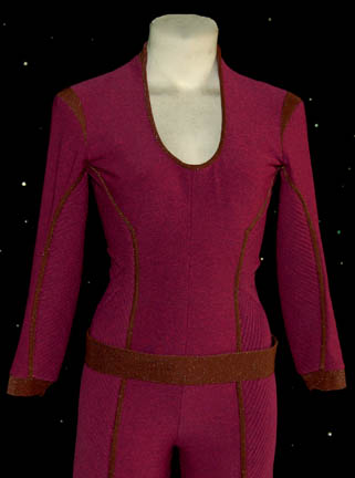 Description: A costume created for wear by Jolene Blalock in her portrayal as “T'Pol” in season three of Star Trek: Enterprise. Upon Earth being attacked by a new alien race, “T’Pol” leaves her commission with the Vulcan High Command to aid her comrades on “Enterprise NX-01” during their dangerous mission into the treacherous Delphic Expanse, searching for the mysterious Xindi. This change in her character brought on several new costumes and a Starfleet officer’s commission. While this uniform is labeled as ‘Not Worn’ on its costumer’s tag, its existence is consistent with her trend in costumes. The item is a plum colored form fitting full length jumpsuit with copper colored piping to accentuate the figure, and pleating under the arms, on the ribs, and down the outside thighs of the legs, and comes with a copper colored belt. The wide neck exposes a sewn in Enterprise tag reading ‘Jolene Blalock 3rd Season #1’. The costumer’s tag also reads ‘T’Pol, Jolene Blalock’ and lists the components.