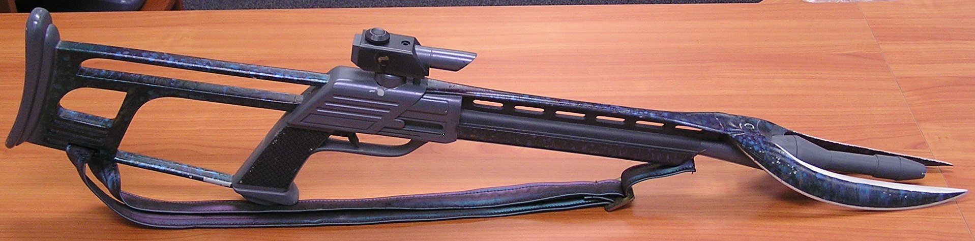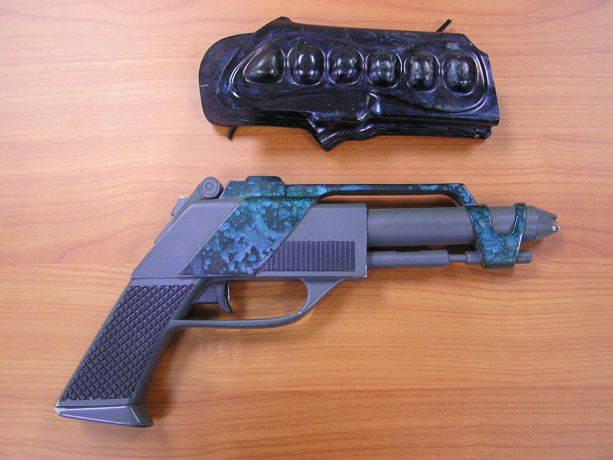 Description: A "hero" prop rifle and pistol made from aluminum and cast resin, the rifle with functional barrel light and red targeting illuminator light in scope with vinyl strap -- <I>35½in. long</I> -- the pistol with holster -- <I>12½in. long</I> (2)