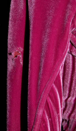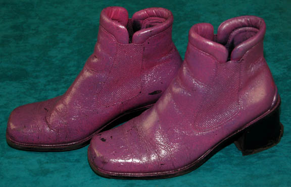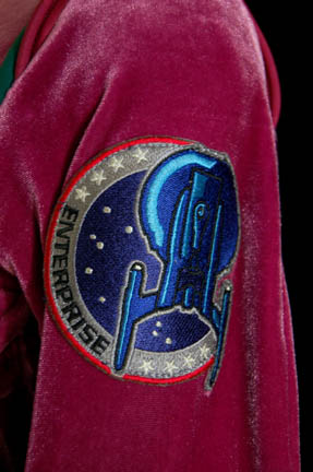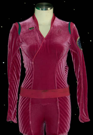 Description: “T'Pol” (Jolene Blalock) was a female Vulcan who served onboard Enterprise NX-01 under Captain Jonathan Archer (Scott Bakkula) during the Star Trek: Enterprise series. This fabulous jumpsuit was made for use by T’Pol during season 3 of the show. The velvet magenta suit has loose pleated detail down the side of the body and inner sleeves. There are three metal rank pips on the right breast, a famous NX-01 Enterprise patch sewn onto the left sleeve and green trim over the shoulders. There are intentional distress holes on the left breast, right sleeve, right leg and a couple of small holes on the back. The sewn in tag reads “Enterprise – Jolene Blalock, Season 3 #2”. Accompanying the suit is the corresponding magenta belt that has some dirt distress on it. Also included are boots that were painted to match. The boots have no name in them however it is likely they were worn by Blalock since they were located with the costume and match the outfit. Costume comes complete with costume tag.