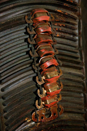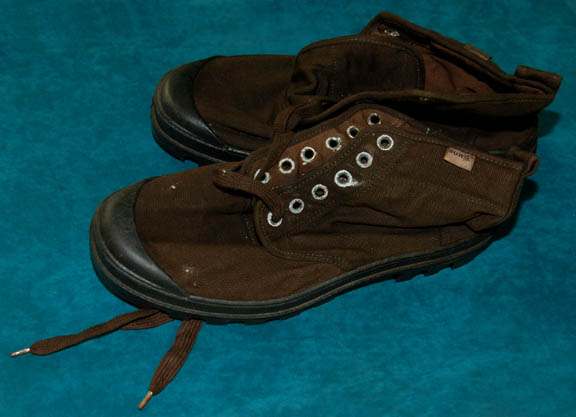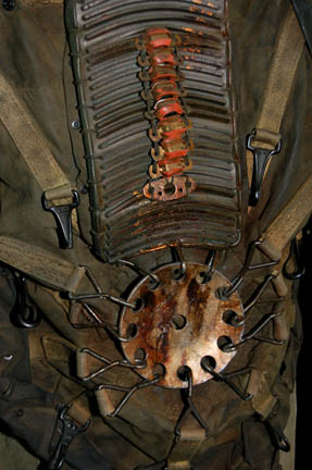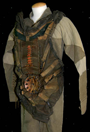Description: A costume featured in the last TNG era feature film, Star Trek: Nemesis; wherein a political coup takes place in the Romulan Empire and the crew of the “Enterprise-E” travel into its heart and “Captain Picard” (Patrick Stewart) finds a familiar face planning the destruction of Earth. This costume is that of a Kolaran, the species that attached the “Enterprise-E” away team when they were investigating the positronic signatures on Kolarus III; it consists of a long-sleeved, full-length jumpsuit in a distressed, aged, yellowish-brown color featuring diagonal quilting along the shoulders, Velcro and laced wrist cuff adjustment, a zip down the front, reinforced quilting at the knees, zipped and laced ankle cuff adjustment. Also included is a piece of heavy-duty, leather body armor featuring metal and rubber accents on the front, various straps and snaps to secure it, netting to help the wearer stay cool, and olive-green canvas shoes.