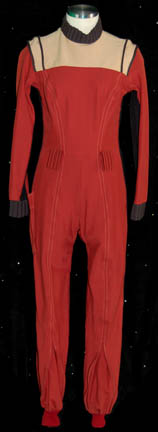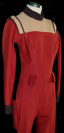 Description: A Starfleet uniform jumpsuit appearing in various Star Trek feature films. The costume is a red jumpsuit with a black ribbed collar and cuffs indicating the wearer to be a crewman, with affixed belt loops, and tan shoulders. The costume comes with these unattached elements: A metal name badge with ‘RAZ' etched into it, a red placement for the left sleeve with a silver and gold colored metal rank badge indicating the wearer to be a ‘senior chief petty officer’, a pair of medical green division strips for the shoulders, a green division strip for the left sleeve below the rank with an affixed silver colored metal commendation bar and a ‘5 year service’ pin and an unattached ‘10 year service’ pin The costume is intended for female wearers. Threads remain from removed elements on the shoulders and the left sleeve.