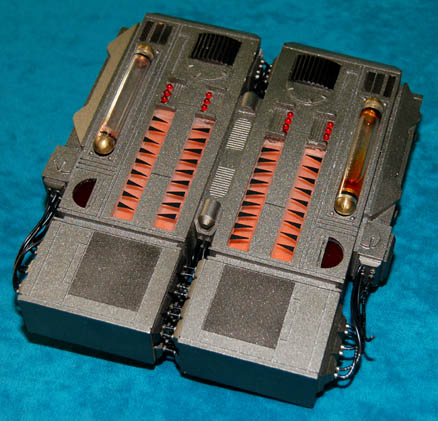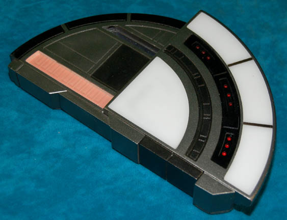 Description: A lot of two prop items featured in the Star Trek: Enterprise episode “Vanishing Point”; wherein “Ensign Sato” has her first transporter experience and thinks that something is happening to her molecules because of it. The first item is part of a series of explosive devices that “Ensign Sato” imagined she saw aliens hooking up to vital systems on the “Enterprise NX-01”; it is a roughly rectangular device, resin cast in a pewter shade, bisected into two identical segments each with a black box at the top, twin clear segments featuring a red background and black triangular accents, two sets of four red LEDs, a tube with an orange colored fluid, a prop “dial” on the other end, faux “circuitry” with wires leading out of it and both pieces screwed together and tied with wire on the bottom. Item has untested electronics and measures approx. 6 X 6.5 X 2 inches. The second device is semi-circular, resin cast in pewter shade, separated into various sized segments, features black accents around the left side and white around the right with a bank of red lights just underneath; a textured pink area on bottom of the left side, further white accents on the lower right hand side, Allen-wench access ports on the bottom and a switch that would activate the untested electronics. This item measures approx. 9 X 5.5 X 1 inches.