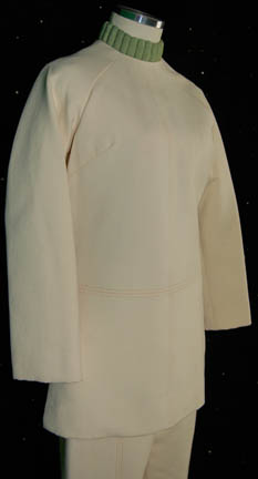 Description: A costume style featured in Star Trek I: The Motion Picture and Star Trek II: The Wrath of Khan for wear by Majel Barrett in her portrayal of “Dr. Christine Chapel”. The costume is Starfleet medical scrubs composed of cream colored trousers with a sewn in Western Costume Co. tag reading ‘Majel Barrett' and a matching top with no identification, a green medical division sleeveless undershirt with a ribbed collar (which would have appeared in Star Trek II) and these unattached items: a green colored cadesus patch for the left breast and a pair of green division strips for the shoulders with a thick gold thread bar indicating the wearer to be a ‘lieutenant’.