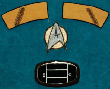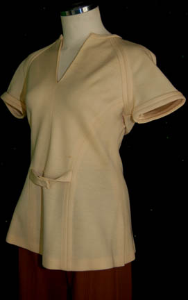 Description: A Class-B Starfleet uniform in the style featured in Star Trek I: The Motion Picture for wear by Persis Khambatta in her portrayal of “Lieutenant Ilia”. The costume is a short sleeved cream colored uniform top with brown trousers. The uniform features a sewn in Western Costume Co. tag reading ‘Persis Khambatta' and the trousers were located separately of the shirt. The costume comes with these unattached elements, a plastic bio-monitor, a yellow backed Starfleet emblem patch for the left breast, and a pair of yellow rank-division strips for the shoulders with a thick bar gold thread band indicating the wearer to be a ‘lieutenant’. The trousers are labeled as being size 8.