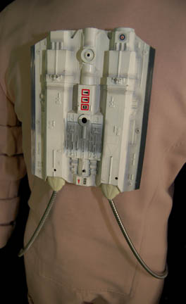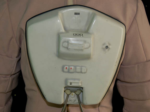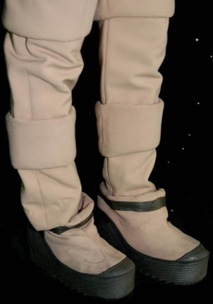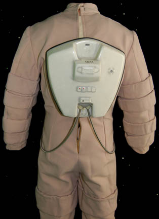 Description: A full length off white uniform jumpsuit featured in Star Trek I: The Motion Picture and appearing in later films like Star Trek III: The Search for Spock. The costume is a jumpsuit with thick bands ribbing the sleeves and legs, with fittings on the chest and back for vacuum formed equipment with molded details to suggest hardware, connected by two lengths of metal wrapped cables on either side. The costume also comes with matching boots.