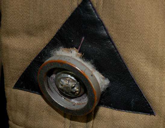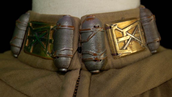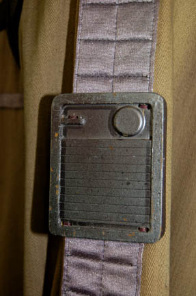 Description: A costume featured in Star Trek IV: The Voyage Home for wear by a member of the Federation Security Council. The costume is an elaborate olive colored jumpsuit with a zip up the center front hidden by a Velcro flap that matches the reflective accents throughout. The costume also features a number of straps and buckles, metal and resin accents to suggest ornamentation and hardware. The costume features a sewn in Western Costume Co. tag.