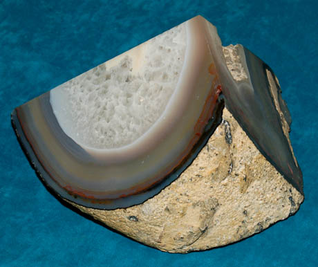 Description: A piece of set dressing similar to those featured throughout Star Trek episodic television. This item is a geode rock used as set dressing in subterranean scenes; this geode is a whitish-yellow on the outside, has numerous, concentric rings in various colors and features a cloudy white crystal formation in the middle with a small cavity on the side featuring further, textured crystal formations. The item measures 8 X 5.5 X 4.5 inches.