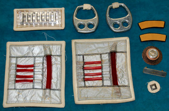Description: A white Starfleet engineer's radiological suit appearing in Star Trek feature films. The costume is a large white jumpsuit with ribbing on the sleeves and legs with an affixed metal breath mask connection on the left breast and an affixed trainee red division strip in the left sleeve with a yellow engineering intention flash. The costume comes with these uattached elements: a white placement with a silver colored metal badge indicating the wearer to be an ‘able-seaman’, a pair of yellow division strips for the shoulders, a name badge with ‘MARVA’ etched into it, a copper colored foil center chest accent, a red ribbed collar indicating the wearer to be a trainee, a pair of silver colored metal rigging loops, a pair of gloves with red tube ‘thermal’ accents, a pair of ‘thermal’ accents for the thighs and one for the left arm, and a reflective silver accent for the waist. The costume also features a sewn on yellow backed Starfleet logo patch on the left shoulder.