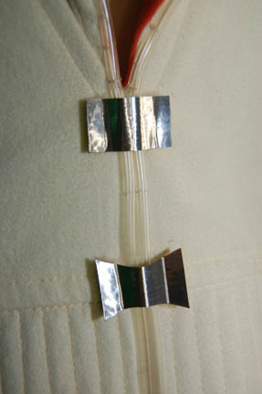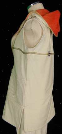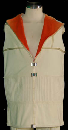 Description: A soft fabric, cream colored 2-piece outfit composed of trousers and a matching sleeveless, hooded top. The garments feature clear plastic tubing held on with silver colored foil accents, the hood interior is orange colored with minimal fading. The costume is intended for female wearers.