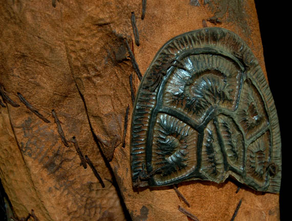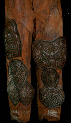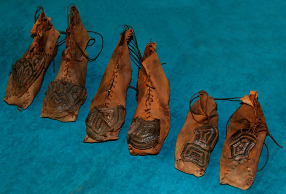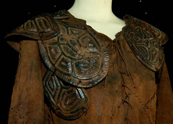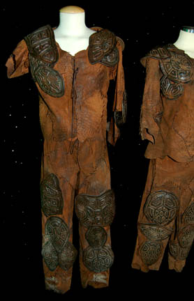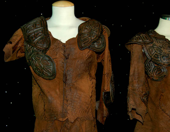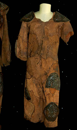 Description: The ‘Novans' were a colony of humans living on the planet Terra Nova who were investigated by “Captain Archer” (Scott Bakula) and his away team during the Star Trek: Enterprise episode “Terra Nova”. The lot includes a Novan man, woman and boy costume. The male costume includes trousers and a top made of brown roughly cut leather pieces that have been hand stitched together. Attached to the legs, arms and shoulders are pieces of sculpted latex that have been painted brown to resemble thick leather. The accompanying shoes are made of Neoprene covered in brown hand stitched leather with faux leather latex pieces attached on top. Costume comes complete with costume tag indicating wear by “Jamin” (Erick Avari); the Novan leader. The female costume includes trousers and top made in the same style as the male costume. Costume comes complete with costume tag indicating wear by “Nadet” (Mary Carver); an elderly Novan woman. The male child costume is also made in the same style but on a smaller scale. The leather lace is missing from the top. It also comes complete with its own costume tag.