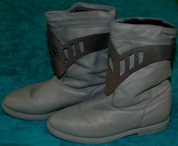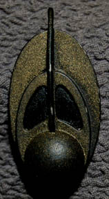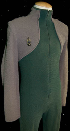 Description: The Bajorans are a humanoid species native to the planet Bajor and were seen throughout the Deep Space Nine series as well as various episodes of Star Trek: The Next Generation and Voyager. This is a Bajoran worker costume that includes a green puckered jumpsuit with gray sleeves and shoulders. A metal Bajoran badge is attached with Velcro to the right breast. Also included are gray boots with Bajoran emblem bands held in place with a snap in the back. Costume comes complete with costume tag.