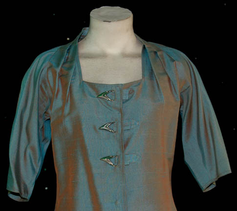 Description: A costume featured in the Star Trek: The Next Generation episode “The Survivors” for wear by “Rishon Uxbridge” (Anne Haney), a woman encountered by the “Enterprise-D” crew with her husband, the sole survivors of a planet ravaged by an alien power, or are they? The costume is teal colored trousers and a cropped sleeved coat with multiple front buckles. The costumer's tag reads ‘151 The Survivors, Rishon, Anne Haney’ and lists the components. The sewn in Deep Space Nine tag indicates further use in other production.