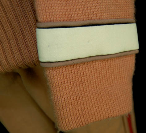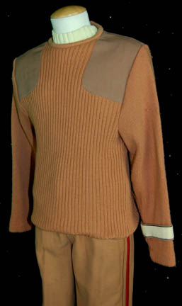 Description: A stunt field duty/commando uniform featured in Star Trek V: The Final Frontier for wear by Greg Barnett in his portrayal of “Spock”. The costume is caramel colored wool trousers with red stripes on the outside seams of the legs, a pair of sleeveless white undershirts with ribbed collars, and a matching caramel colored wool sweater with patching over the shoulders and a command white division strip affixed to the left sleeve forearm. The trousers feature a sewn in Paramount tag reading ‘Spock nylon harness', the sweater tag reads ‘Barnett’, and the sewn in shirts vary, one tag reads ‘Spock Nimoy’, the other reads ‘Leonard Nimoy’ but is next to a seam which has penned in ‘Barnett’. Costumer’s tags read ‘Nimoy DBL?’ and “Star Trek V, Leonard Nimoy as Spock, CHG# 3, 3a, 3b, nylon harness’.