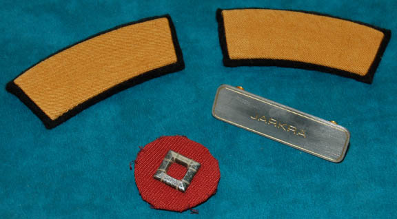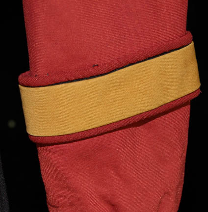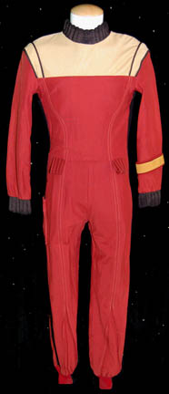 Description: A Starfleet uniform jumpsuit appearing in various Star Trek feature films. The costume is a red jumpsuit with a black ribbed collar and cuffs indicating the wearer to be a crewman, with affixed belt loops, an affixed yellow engineering division strip on the left sleeve, and tan shoulders. The costume comes with these unattached elements: A metal name badge with ‘JARKRA' etched into it, a red placement for the left sleeve with a silver colored metal rank badge indicating the wearer to be an ‘able seaman’, and a pair of yellow division strips for the shoulders. The costume is intended for male wearers.
