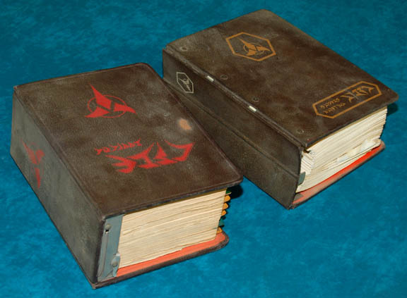 Description: A lot of two prop items believed to have been featured in the sixth Star Trek feature film, wherein the Klingon moon of Praxis explodes and the Empire cannot deal with the repercussions of this and afford their tremendous military budget so the Federation is approached for a possible end to 70 years of hostility but not everyone wants to see the fighting end. The items are two books but are believed to been used and are very similar to the books featured in the scene where the crew of the “Enterprise-A” are racing to Rura Penthe and trying to answer the patrol that hails them in actual Klingon because the Universal Translator would be recognized; the books; the books are large, very thick, binder-style taxation manuals from the 1950's but with the Klingon symbol and Klingon script on the covers. These items both measure approx.1 0 X 7.5 X 4.5 inches.