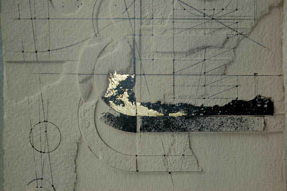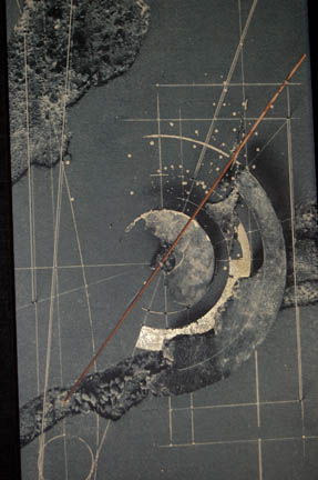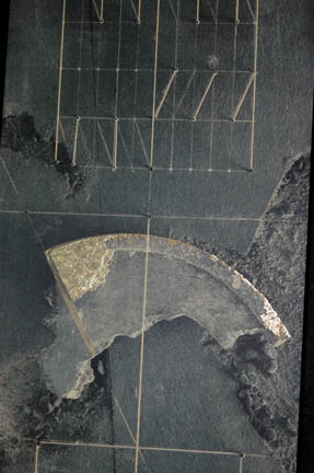 Description: Three pictures made for use as set dressing in “Tom Paris's” (Robert Duncan McNeill) quarters onboard the U.S.S. Voyager during the Star Trek: Voyager series. Two pictures are oblong geometric prints in gray with gold colored detail. Each has a black canvas border and a metal frame. On the back of one it reads “Paris ¼’s, Right Side” and the other reads “Paris ¼’s, Left Side”. One the back of both pictures is further writing indicating both pieces were also used as set dressing on the Pathfinder Lab set. The third picture is also geometric in style but lighter in color than the oblong pictures. The print is attached on top of the metal border and frame. On the back it reads “Voy, Paris Qtrs”. Oblong pictures each measure “43 x 20 ¼ inches. Smaller picture measures approx. 31 x 24 inches.