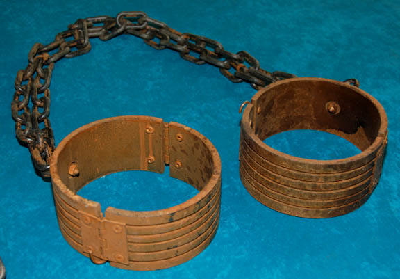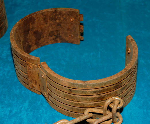 Description: A lot of prop items featured in the sixth Star Trek feature film, “the Undiscovered Country”; wherein the Klingon moon of Praxis explodes and the Empire cannot deal with the repercussions of this and afford their tremendous military budget so the Federation is approached for a possible end to 70 years of hostility but not everyone wants to see the fighting end. This item is the manacles that the changeling character “Martia” (Iman) wore while in the guise known as “The Brute” (Tom Morga) so that she could change form and just slip out of them; they are rust-colored, plastic manacles made to look dusty or rusted metal, attached to metal-colored plastic chains, another identical, single manacle, and yet another identical pair attached to actual, metal chains painted the same color as the manacles. The manacles themselves all have an approx. 7 inch diameter; the chains are all approx. 34 inches respectively.