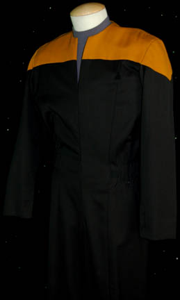 Description: A costume featured in various episodes of Star Trek: Voyager for wear by Garrett Wang in the role of the Operations Officer for the Starship “Voyager”, “Ensign Harry Kim”. This costume is a type-B Starfleet uniform consisting of long-sleeved, full-length, black jumpsuit featuring Operations Gold division colors along the shoulders, Velcro patch for a commbadge (not included), hoops at the waist for instruments and tools, stirrups for the feet, and a short-sleeved, blue-gray undershirt sewn onto a matching undergarment. A sewn in tag reads ‘Voyager, Garrett Wang' and a costumer’s tag reads ‘Harry Kim, Garrett Wang, Voyager’.