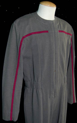 Description: A costume similar to those featured in the Star Trek: Voyager episode “Friendship One”; wherein Starfleet orders “Voyager” to investigate and retrieve what they believe to be a 21st century Earth probe lost in the Delta Quadrant. This costume is for wear by Robert Duncan McNeill in the role of the Helm Officer for the Starship “Voyager”, “Lt. Tom Paris”, and is the EVA under suit worn down to the planet they were directed to; it is a long-sleeved, full-length, gray jumpsuit in a heavy duty fabric, Command Red division strip across the chess and down the sleeves, a zip down the front and stirrups for the feet. A sewn in tag reads ‘Voyager, Robert McNeill'