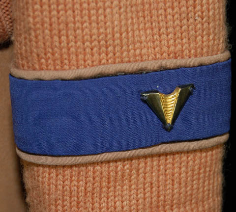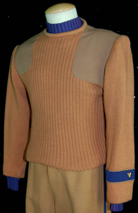 Description: A security division uniform featured in Star Trek V: The Final Frontier consisting of caramel colored wool trousers with purple division stripes down the outside seam, a purple long sleeved undershirt with a ribbed collar and cuffs, and a wool sweater with a purple division strip around the left sleeve and an affixed gold and silver colored metal ‘ensign' rank badge sewn onto it.