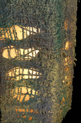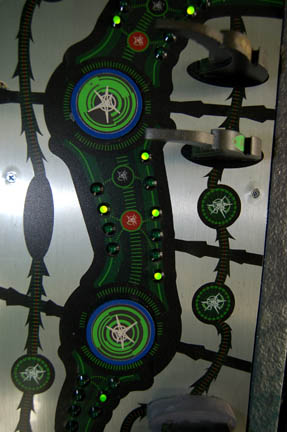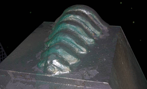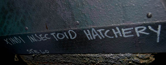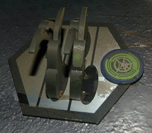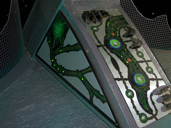 Description: A Xindi-Insectoid hatchery featured in the Star Trek: Enterprise episode “Hatchery” in which the crew of the Enterprise NX-01 found an abandoned Xindi-Insectoid ship carrying a collection of unhatched eggs. The hatchery is made of particleboard painted purple with faux moss around the back stand. The back stand lights up and is powered by a standard U.S.A. 120V Type-B three-pronged plug. Two wires near the plug outlet light up sequentially flashing green LED lights all over the top panels when a 9V battery is held to them. Wire fixtures, resin claws and Xindi style applications have been applied for detail. Several of the claws are Measures approx. 72 x 38 x 53 inches.
