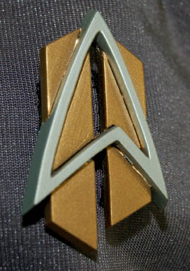 Description: An impressive futuristic gray Starfleet jumpsuit with black trim around the shoulders. There is a zip up the back, an adjustable internal waistband and a small Velcro patch on the left side of the chest for a Combadge to attach. The accompanying Combadge is in the alternate timeline style and made of resin painted gold and silver. This style of costume was featured in episodes that involved alternate timelines such as Star Trek: Voyager, “Endgame”. Costume comes complete with costume tag.