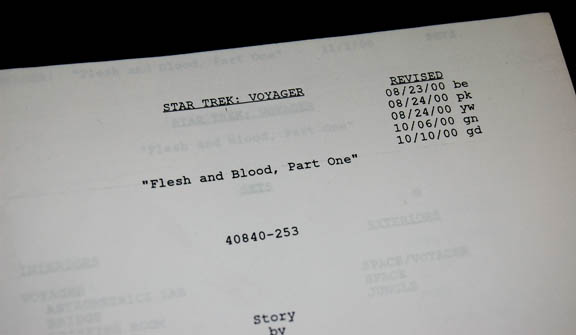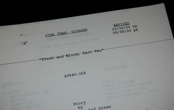 Description: A set of two scripts of the Star Trek: Voyager two part episode “Flesh and Blood”; wherein “Voyager” responds to a distress call from some Hirogen who seem to have been decimated by the very holograms they have been “hunting” and finds that the holograms are just doing as they programmed, but just too well for the Hirogen. Both scripts are final versions and are sealed for protection.