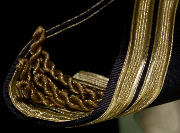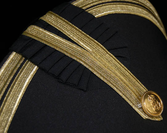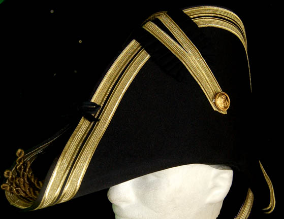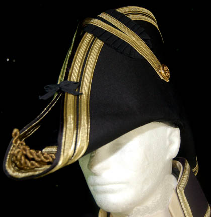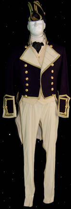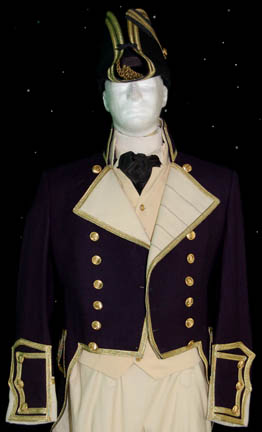 Description: A costume featured in the seventh Star Trek feature film and the only one to have members of the Original series and members of the Next Generation, aptly titled “Generation”; wherein the “Captain Picard” (Patrick Stewart) enlists the help of the long presumed dead “Captain Kirk” (William Shatner) to assist him in stopping a mad man who is destroying whole solar systems for his own selfish ends. This costume is that of an English naval officer circa the late 18th century; a long-sleeved, off-white, button-down shirt with slightly frilly sleeves, a crème-colored vest with gold-colored buttons, and matching overall-style trousers with stirrups for the feet. Also included is navy blue jacket and tails, featuring the same gold-colored buttons with the naval symbol as the vest, gold trim accents, white cuffs and a white open collar; a black tie, a matching black officer's hat with more gold trim and buttons, and black, rubber boots that reach just under the knees. A sewn in tag reads ‘Star Trek VII, Brian Williams’, Brent Spiner’s stunt double, and a costumer’s tag that reads ‘Star Trek VII, Data Stunt, B. Williams’.