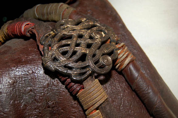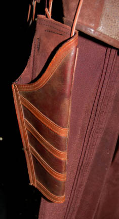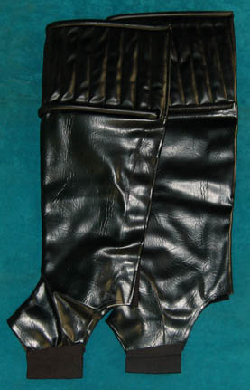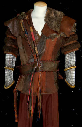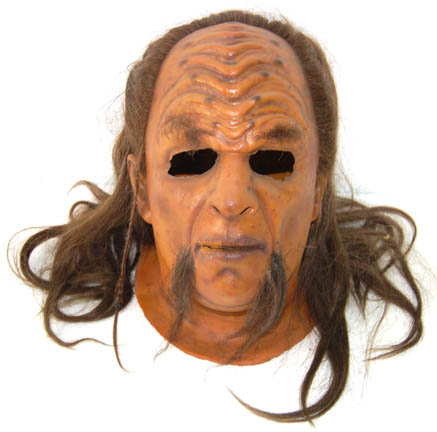 Description: This imposing Klingon costume was made for wear during the Star Trek: Enterprise series. The coat is made of stitched brown and tan leather pieces with an assortment of leather and faux fur pieces attached to the shoulders for detail. The sleeves are made from a combination of faux fur and chain-mail at the bottom. Brass colored metal rings have been added around the chain-mail for decoration. The harness is made from an amalgamation of leather pieces over a fabric frame complete with leather rope style details and leather stitching. The trousers are chocolate brown with pleats down the front and back and stirrups at the feet. Black spats are added for around the legs. Costume comes complete with costume tag that reads, “Enterprise, Klingon” and the names of four background actors including stunt man J.G. Hertzler. Also included is a full head Klingon mask used in Star Trek VI: Undiscovered Country, during a courtroom scene that involved around 200 Klingons. In order to dress that many actors in Klingon makeup, the background actors in the upper balconies wore these full faced masks to make the process quicker than actually attaching individual prosthetics to their faces. This latex head has been completely painted and airbrushed with hair attached behind the forehead ridges. Facial hair has been added for eyebrows and a two part beard. Under the hair at the back of the head is a concealed Velcro strip to allow the wearer to take the mask on and off more easily. Measures approx. 12 x 7 x 11 ½ inches.