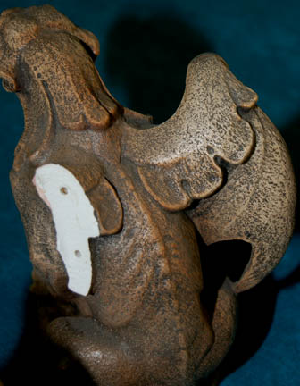 Description: A trio of plaster gargoyles featured in the Star Trek: Enterprise episode “Civilization” appearing in the scene taking place as an “Enterprise” away team enters the shop of an alien in disguise. The gargoyles are painted beige with distress to appear aged and made to have their left wing ‘fixed' as they were being glued back together in the episode. The wings are attached by way of a pair of metal pins within. One of the gargoyle’s wings is actually chipped due to time and storage conditions. The gargoyles are quite fearsome and measure approx. 5 X 5.5 X 4.5 inches.