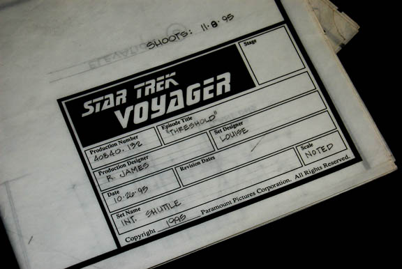 Description: A set of blueprint schematic s used to build the enhanced trans-warp shuttle “Cochran” for the Star Trek: Voyager episode “Threshold”; wherein “Tom Paris” (Robert Duncan McNeill) breaks the trans-warp barrier in an enhanced shuttle but the short flight begins to change and mutate him. This set of blueprints includes exterior and interior schematics and has the show name, stage, production number, episode name, original date, and set name.