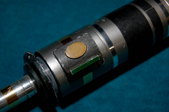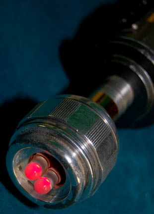 Description: A 24th century electronic Starfleet device made for use on one of the 24th century series, most likely but not limited to Star Trek: Deep Space Nine and/or Voyager. The prop is made of resin painted gun-metal gray with a metal tip. Around the device are black, gold and silver colored applications for detail. A button on the bottom activates two red LED lights in the tip. Measures approx. 8 x 1 ½ inches.
