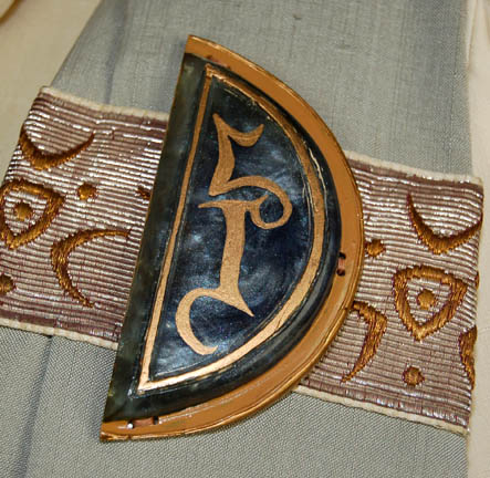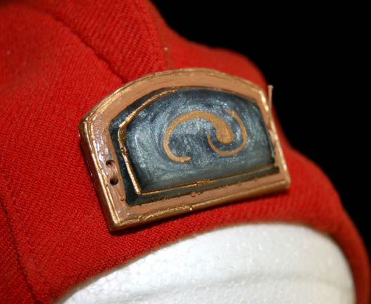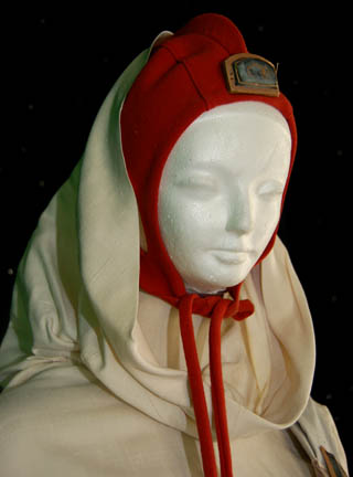 Description: The Vulcans are a humanoid race from the plant Vulcan who are known for their great sense of logic and stoic nature. They were one of the instrumental species responsible for establishing the United Federation of Planets and were featured throughout the Star Trek anthology. This Vulcan costume is believed to have been used by a background actor during the final scenes of Star Trek III: Search for Spock in which “Spock's” (Leonard Nimoy) soul was restored to him after a successful mind meld with “Dr. McCoy” (DeForest Kelley). The cream robe has layered sleeves, a hood and a zip up the back. Worn over the top is a gray sash with a band with woven symbols and a sewn on half-moon resin decoration. The decoration is blue with gold trim and a gold Vulcan symbol painted on it. Accompanying the robe is a rust color skull cap with holes for the ears to protrude through, a circular resin decoration on the front, a pointed fin running from the front of the cap to the back and a chin tie.