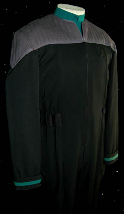 Description: A costume featured in Star Trek VIII: First Contact for wear by Robert Picardo in his portrayal of the “Emergency Holographic Doctor” on board the “USS Enterprise-E”. The costume is a black Starfleet uniform jumpsuit with a form fitting elastic waist, ‘away team' gear loops sewn into the waist, quilted gray shoulders, a Velcro placement for a Starfleet combadge (sold separately), and sciences blue division strips around the cuffs. The costume comes with a sciences blue long sleeve undershirt. The item was located in the Robert Picardo collection and the sewn in tag reads ‘H. DR’.