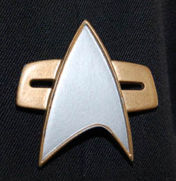 Description: A costume featured in various Star Trek: Voyager episodes for wear by Robert Duncan McNeill in his portrayal of “Tom Paris”. The costume is a black Starfleet uniform jumpsuit with command red shoulders and sewn in ‘away team' gear loops on the form fitting waist, with a Velcro placement for an accompanying resin Starfleet combadge which was located with the costume that is painted metallic silver and metallic gold. The costume also comes with a gray undershirt and a bronze colored metal pin back for the attachment of two matching pins indicating the wearer to be a ‘lieutenant’, all of which was located with the costume. Additionally, the costume comes with matching leather shoes which were not located with the uniform. The components feature sewn in Voyager tags reading ‘Robert Duncan McNeill’.