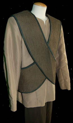 Description: A costume made for wear in the ninth Star Trek feature film, “Insurrection”; wherein the crew of the “Enterprise-E” rebels against Starfleet and the Federation to prevent the exploitation of a defenseless race called the Baku. This costume was made for wear by Michael Dorm in the role of the only Klingon Starfleet Officer, “Commander Worf”; it consists of a long-sleeved, tan tunic featuring a slightly raised diamond pattern, dark gray, overall-style trousers with stirrups for the feet, a harness/vest in an “X” shape of an olive green fabric featuring a textured, crumpled feel, a slightly darker green trim made to look like it was sewn on, and brown, suede hiking boots with dirt and rocks left in the tread from production. All items were found in the “Worf” section and a include a costumer's tag that reads ‘Worf, change 4, scene 135-277, civilian clothes, Star Trek IX’.