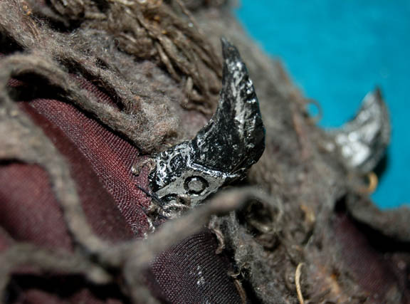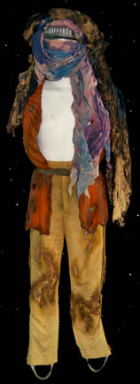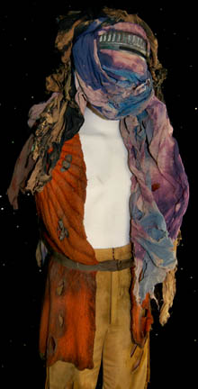 Description: A costume featured in the second Star Trek feature film, “The Wrath of Kahn”; wherein “Khan Noonien Singh” (Ricardo Montalban) escapes exile and attempts to exact his revenge on “Admiral Kirk” (William Shatner). This costume is for wear by Judson Scott in the role of “Joachim”, one of the augmented humans from the 20th century that had vowed his loyalty to “Kahn”; it consists of three yellow trousers featuring string tied down the sides. A quilted, orange vest featuring the remnants of brown, short sleeves, brown gloves with shreds of fabric glued to them, hiking boots covered in yellow fabric making them reach just under the knee, strings like on the trousers, and a long strip of fabric to tie around the top; two necklaces of faux suede with random wires and pieces of circuitry arranged like they were jewelry, and a resin faceplate featuring a thin strip to see out of and covered with enough multi-colored fabric shreds to enshroud and protect the head from the savage environment of Seti Alpha V. items and extremely distressed in the form of rips, tears and stains all over and feature tags that denote use by Judson Scott.