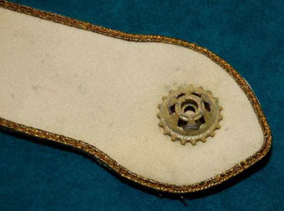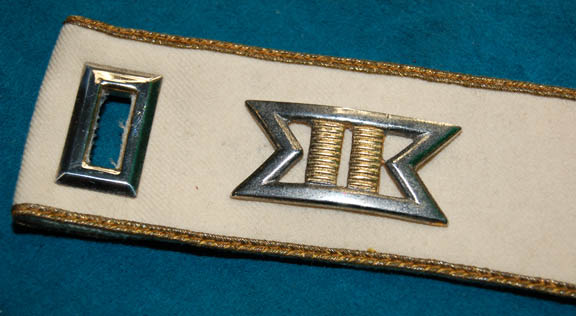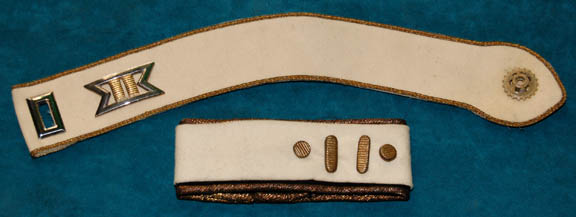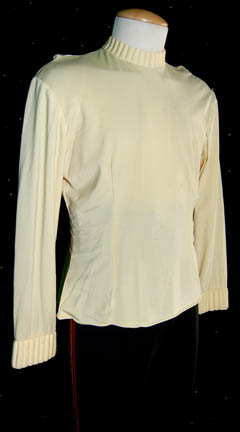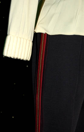 Description: Almost a whole costume, these components are the style of uniform appearing throughout the Star Trek Feature films. The costume is black Starfleet uniform trousers with red division stripes for the outside seams that feature a line of gold trim in the center, a white long sleeved undershirt with a ribbed collar and cuffs, and corresponding officer's division strips; a gold trimmed command white colored sleeve strip with two affixed gold colored metal commendation bars and a pair of ‘5 year service’ pins, and a shoulder strip with an affixed gold and silver colored metal ‘commander’ rank badge and an affixed ‘security disk’. The costume also comes with a matching ‘commander’ rank badge on a red placement. The costume is intended for male wearers.