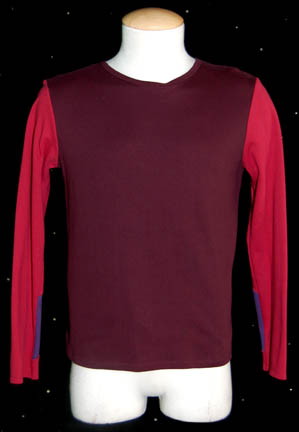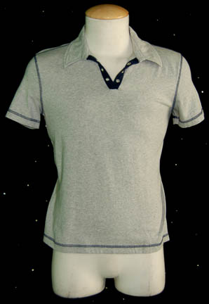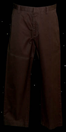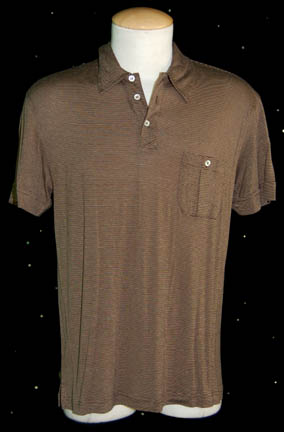 Description: “Trip Tucker” (Connor Trinneer) civilian costume lot made for wear on the Star Trek: Enterprise series. The lot includes a gray collared t-shirt with blue stitched trim; a brown and black striped “DKNY” t-shirt with a collar, buttons and pocket and a long sleeved brown t-shirt with crimson and mauve sleeves. The gray t-shirt and “DKNY” t-shirt both have sewn in tags that read “Enterprise, Connor Trinneer”. Also included are two pairs of trousers; a black pair from “Banana Republic” and a gray pair from “Kenneth Cole”. Both pairs of trousers have sewn in tags that read, “Enterprise, Connor Trinneer”.