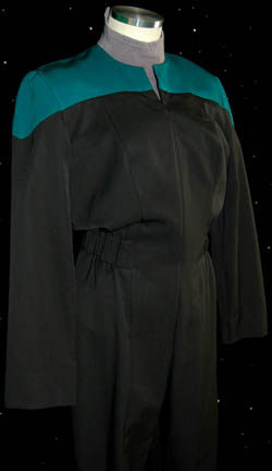 Description: A female Sciences Blue Starfleet uniform made for wear during the Star Trek: Voyager series. The uniform is black with Sciences blue shoulders, a small Velcro patch on the left breast for a Combadge (not included) to attach, a zip up the front and two pleats in the back. Around the waist are loops for away-team gear (not included) to attach. A gray long sleeved undershirt accompanies the jumpsuit that has one tiny hole in it on the shoulder.. Costume comes complete with costume tag.