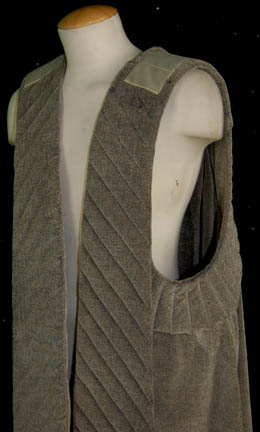 Description: A robe featured variously throughout 24th century Star Trek episodic television. This costume is a full-length, sleeveless gray robe featuring diagonal quilting down the front, under the arms, and across the shoulders; pleating down the back, and was found in the Klingon section.