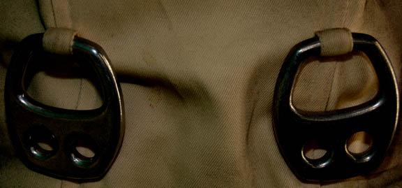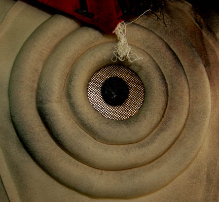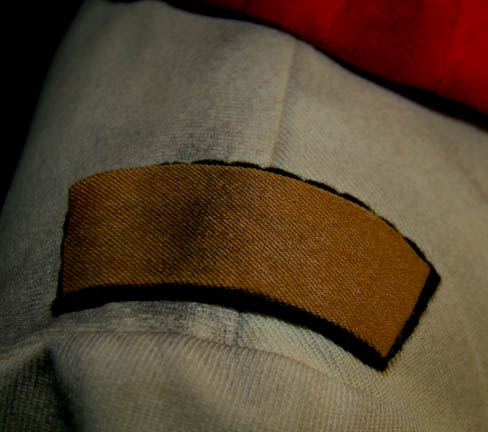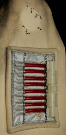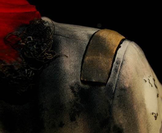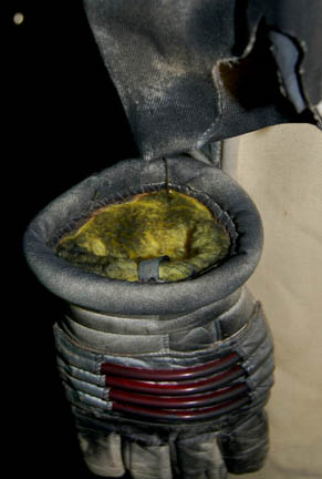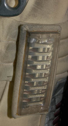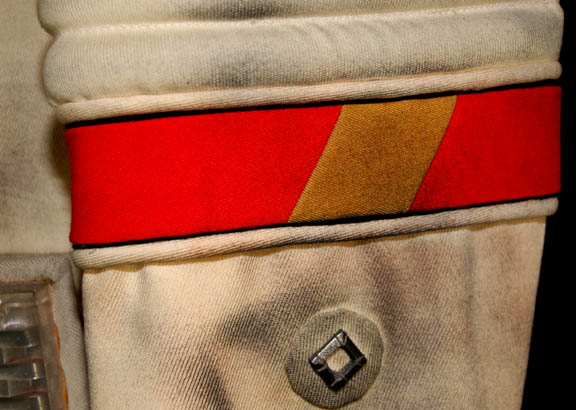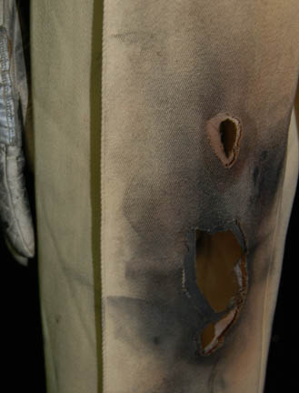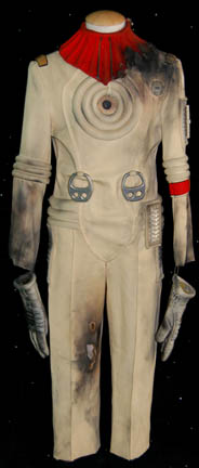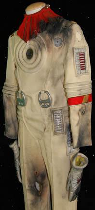 Description: An Starfleet engineer's white radiological suit appearing in various Star Trek feature films like Star Trek II: The Wrath of Khan or Star Trek VI: The Undiscovered Country. The costume is a jumpsuit with ribbed accents around the waist, elbows and on the chest. The costume comes with these attached elements, a pair of engineering yellow division strips on the shoulders, a pair of silver colored metal rigging loops on the waist, a copper colored foil center chest accent, a silver colored metal breath mask connection on the left breast, a pair of opposing red tube ‘thermal’ accents on the thighs and one on the left sleeve, and a one reflective silver colored accent on the waist; and as for the left sleeve a trainee red division strip with a gold intention flash and a white placement with e silver colored metal badge indicating the wearer to be an ‘able-seaman’. The costume also features these unattached elements: a red ribbed collar indicating the wearer to be a trainee, a silver colored name badge reading ‘KRIM’, and a pair of gloves with red tubing ‘thermal’ accents on the outside. The costume is heavily distressed to depict the danger of battle. The costume features holes in the right knee, and general blackening to depict’ scorching’, many of the attached elements are also ‘scorched’, the absence of a Starfleet emblem patch on the left shoulder is apparent due to an outlining of scorching and remaining threads.