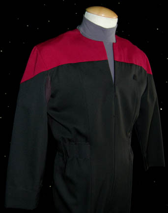 Description: A male Command Red Starfleet uniform made for wear during the Star Trek: Voyager series. The uniform is black with Command red shoulders, a small Velcro patch on the left breast for a Combadge (not included) to attach, a zip up the front and two pleats in the back. Around the waist are loops for away-team gear (not included) to attach. A gray long sleeved undershirt accompanies the jumpsuit. Costume comes complete with costume tag.