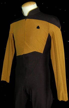 Description: A Star Trek: The Next Generation male Operations gold Starfleet uniform made for wear during the series and/or ‘The Next Generation' movies. The jumpsuit is black with Operations gold sleeves and upper torso. There is gold trim around the collar, a small Velcro patch on the left breast for a Combadge (not included) to attach and a zip up the front. Costume comes with costume tag.